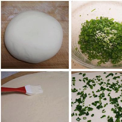 3、发酵好的面团擀开排气,擀成均匀的面片,刷上一层食用油,撒上香葱。