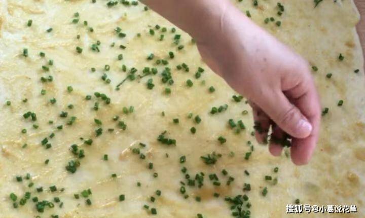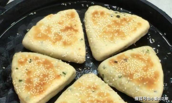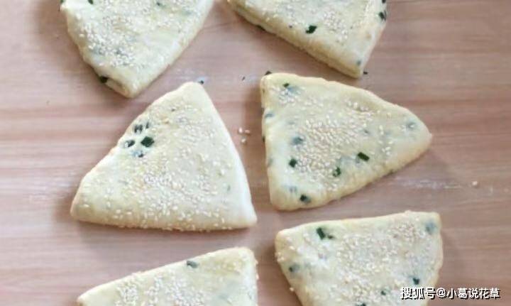 3.此时面团已经醒发。案板上抹少许食用油,将面团取出,擀成长方形饼皮,擀薄。将酥皮铺在上面,撒上葱花,从一侧卷起,卷起边缘,揉牢。揉几天后,将其分成大小相等的面团。 4、取一个面团,将两端包起来,防止漏气,然后擀成鸭舌状,卷起来压成圆饼,再擀成圆饼皮,对折再对折又分成两半。擀成三角形,两面撒上芝麻,卷紧。