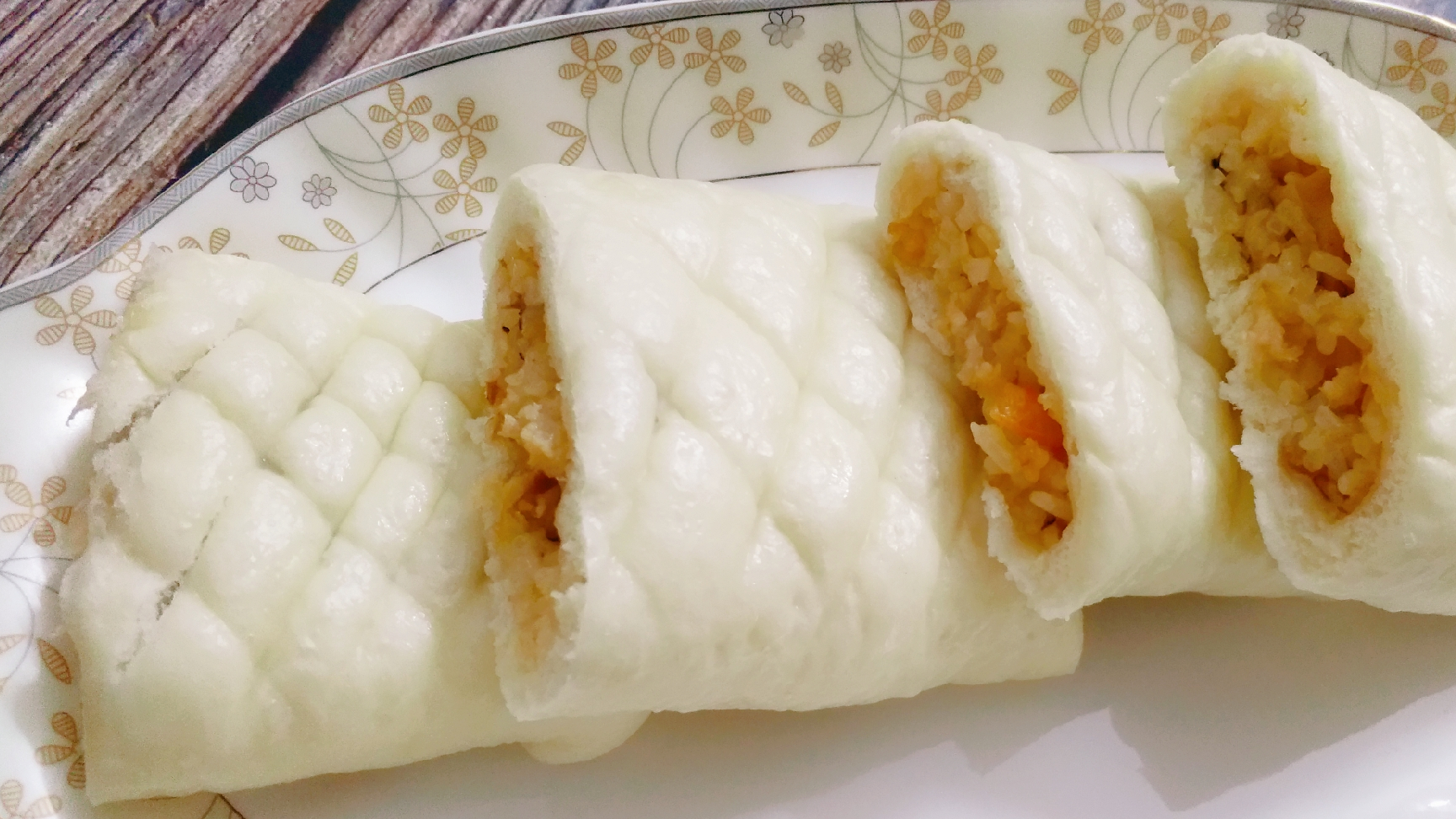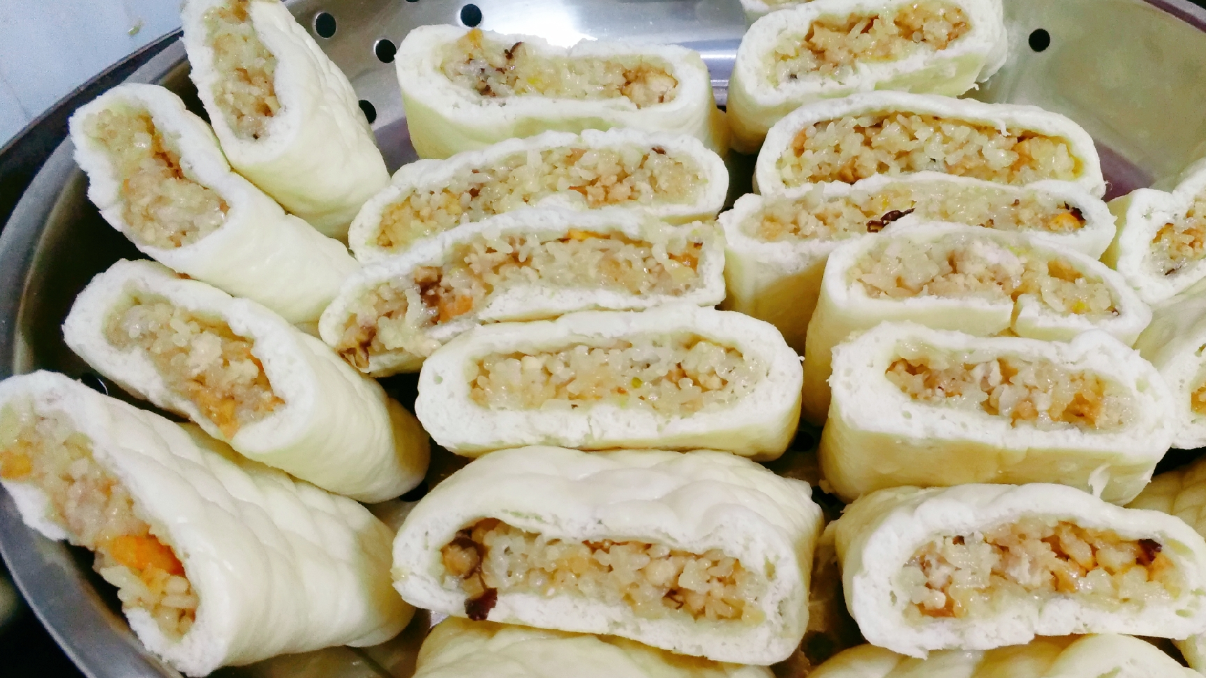 蒸好关火后焖5分钟再揭盖,时间到拿出来切块,1斤面粉我做了一大笼糯米卷,馅料足,软糯鲜香比烧麦还好吃,吃得真过瘾。