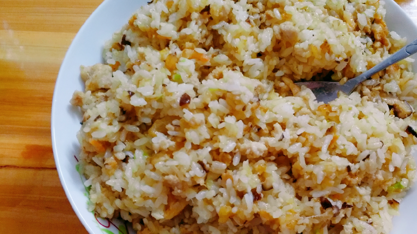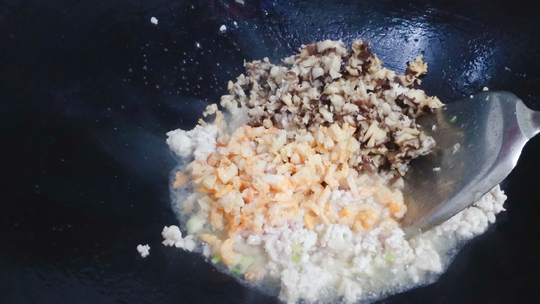 第5步:把煮熟的糯米饭倒出晾凉,可以升风扇吹,那样会快很多,热锅热油,爆一下葱末,加入肉泥煸炒到变色,再加入香菇、虾米一起翻炒两分钟。