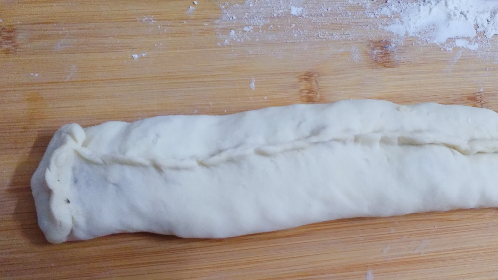 第8步:把发好的面团揉搓小会排气,分成量差不多的6个剂子,然后取1剂子搓成椭圆形,用擀面杖成面皮,包入馅料,想包多点馅皮可稍薄,厚薄自己决定。