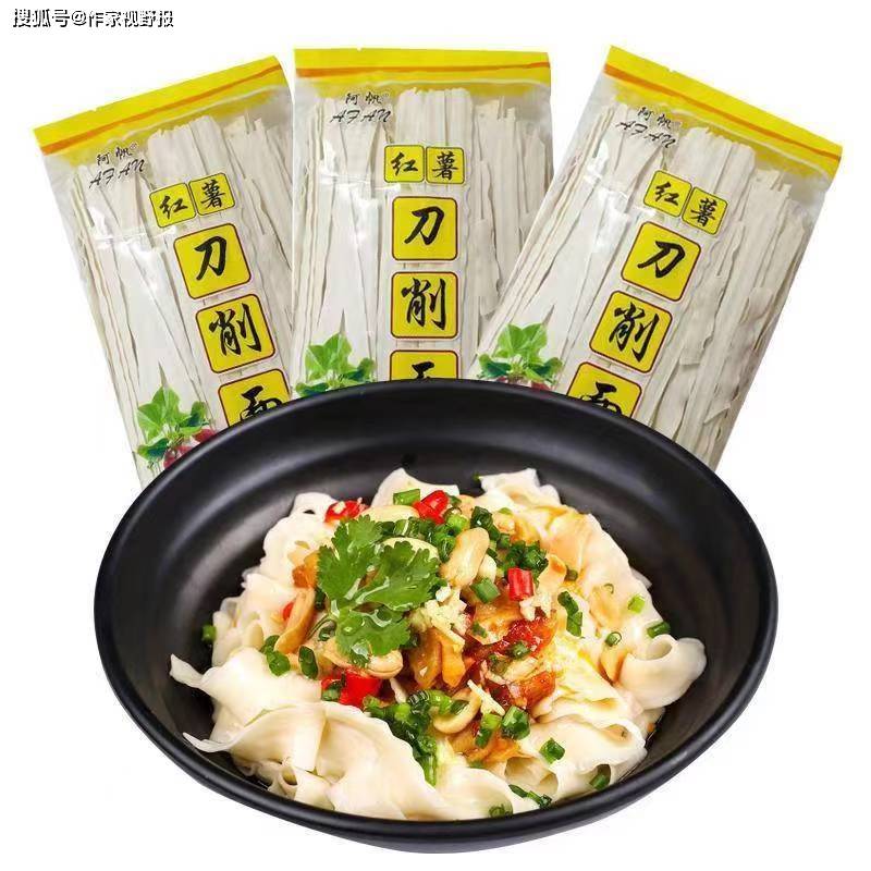 近些年来,家乡人借国家发展现代农业的好政策,改良出紫檀红、骑龙红、姜牌红等多个红薯品种,而且一年种两季。食品加工企业开发出用红薯粉和小麦粉为主原料的红薯刀削面。这种面保留了小麦面粉的清香味,煮出来之后是非常爽滑劲道,它不会有糊汤,而且非常耐煮,老少皆宜。面客们可根据个人口味,可作汤面吃,可从汤中捞起同佐料一起拌着吃,可在吃火锅时将干红薯面条下在锅里同其他食材一起煮着吃。