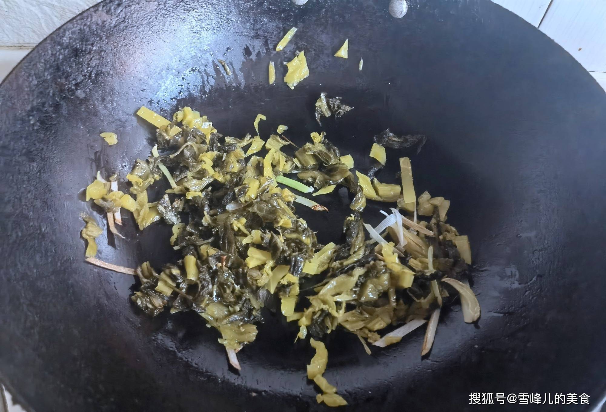 第二步:锅里放入少许花生油,放入葱丝姜丝爆香,倒入酸菜丝煸炒均匀,倒入少许生抽炒匀提鲜。。
