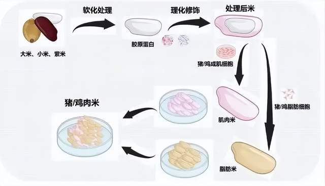这个过程听起来似乎有些不可思议,但实际上是可行的。科研人员利用鸡、猪肌肉和鸡、猪脂肪细胞贴壁生长的特性,将大米、小米及紫米进行预处理后作为支架,为猪、鸡细胞生长提供微环境,使细胞在其表面增殖和分化,最终形成了鸡肉米和猪肉米。