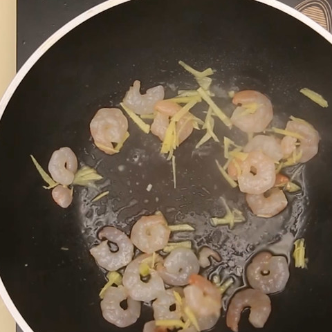 3.放油,虾仁入锅翻炒一会,然后倒入姜丝翻炒一会后装盘