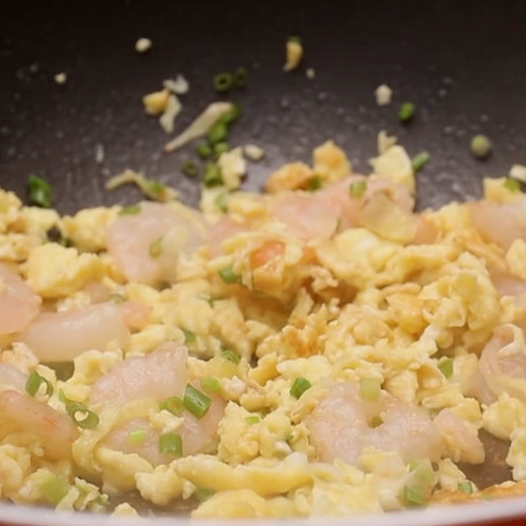 虾仁300克、鸡蛋3个、橄榄油15克、精盐4克、花生油20毫升、姜丝5克、生抽3克、葱20克
