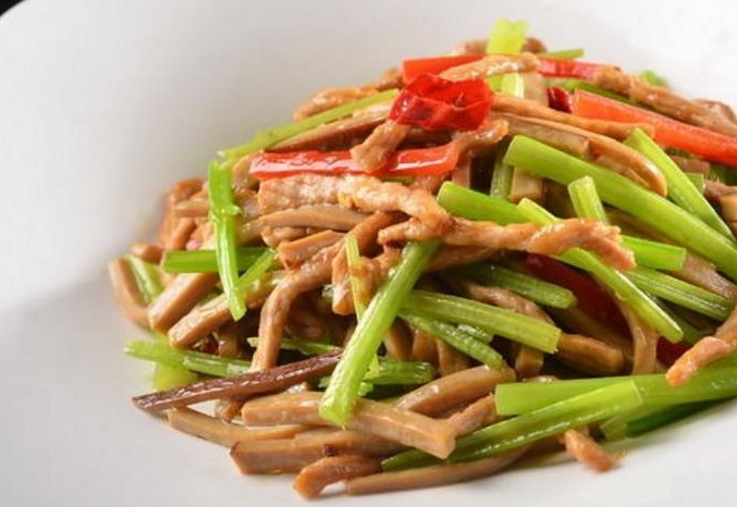 接下来是肉丝香干,我们准备150克香干,150克猪肉,适量的葱花,少量的辣椒段,15克酱油,十克蚝油,少量的清水,五克料酒,两颗蒜末,先把香干切成丝,再把猪肉切成丝,热锅放上适量的花生油,然后,放入蒜末,炒出香味,再放入肉丝翻炒,接下来加上蚝油料酒,酱油翻炒均匀之后捞出来备用,接下来在锅里面放上油,调到中火,大约放入香干,翻炒两分钟,再把肉丝倒进去翻炒,加上辣椒酱和盐,再放上清水焖煮两分钟就可以出锅了。