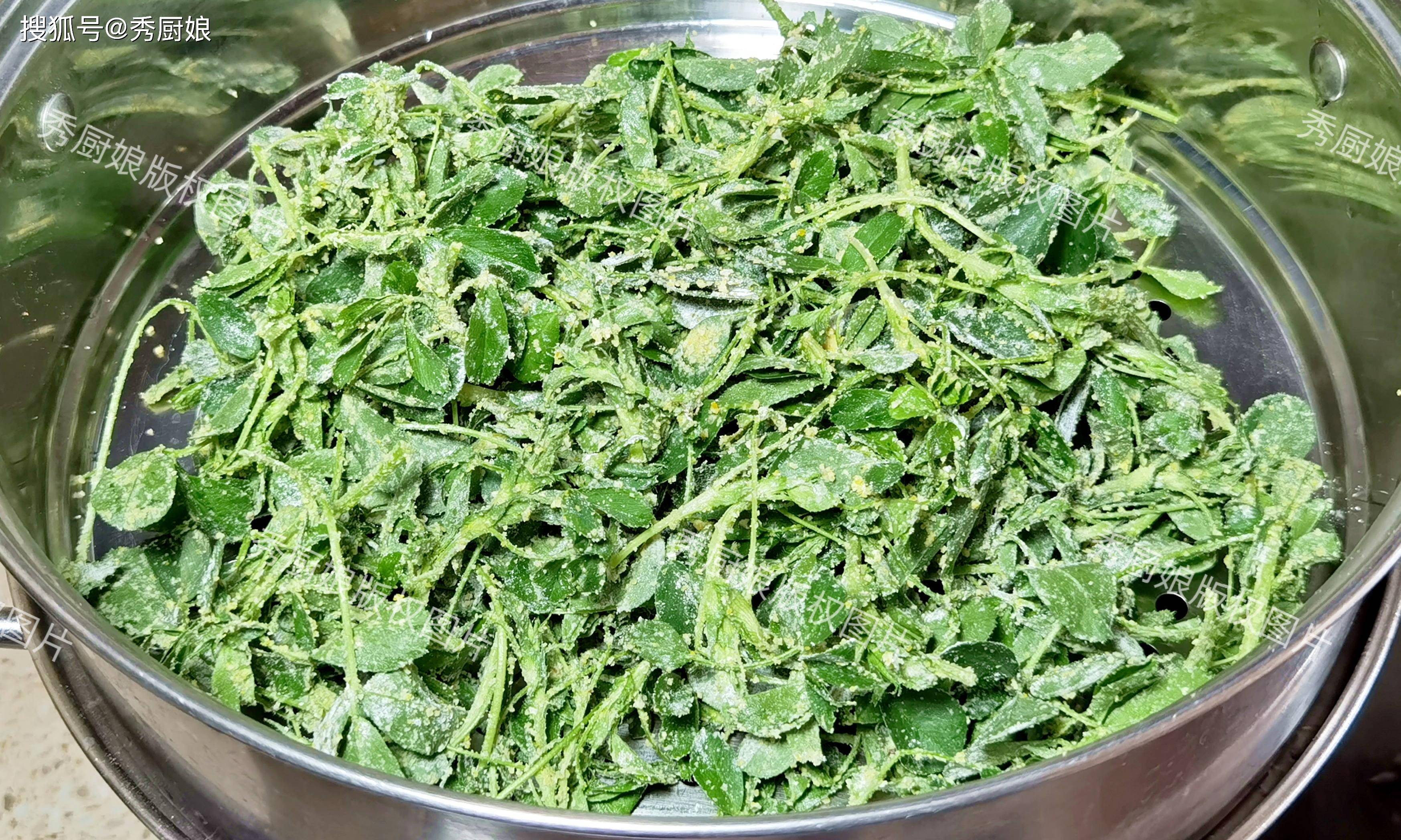 3. 蒸制苜蓿菜:蒸锅中加入适量的水,烧开后,将搅拌均匀的苜蓿菜放入蒸屉中,盖上锅盖,大火蒸10-15分钟,直到苜蓿菜熟透为止。