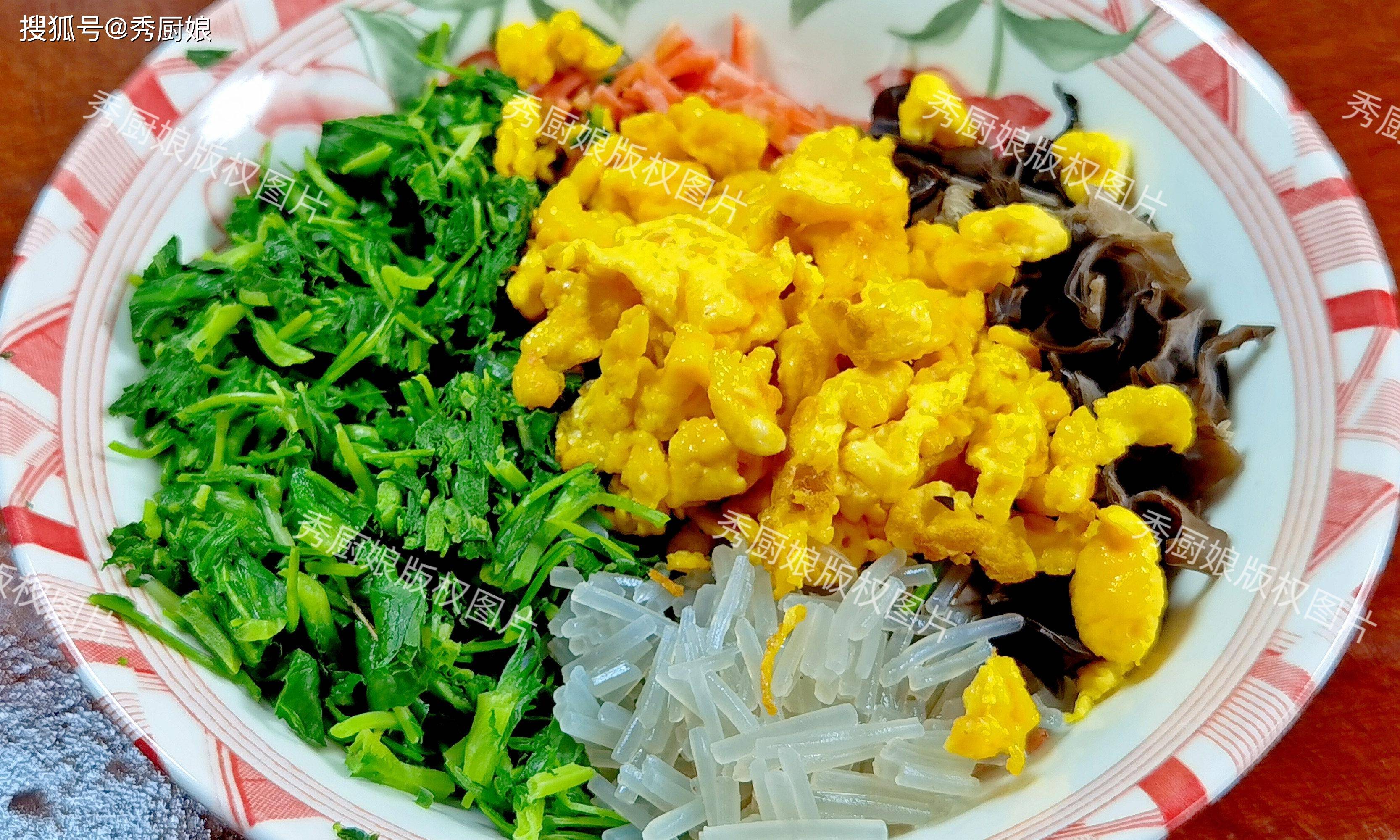 2. 处理食材:将苜蓿菜摘洗干净,焯水后切成细末,放入大碗中备用;将粉条用温水泡软,沥干水分后切成小段,将黑木耳用温水泡发后切成碎;将胡萝卜去皮,切成碎;将鸡蛋打散,加入少许盐,在锅中煎成蛋饼,然后切碎备用。