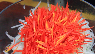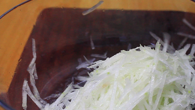 第一步,洗净的冬瓜去掉瓤然后在去掉皮,然后把冬瓜插成细丝,在准备一个胡萝卜也插成细丝,盆里加入一勺盐,搅拌均匀后腌制上10分钟,沙出水份。