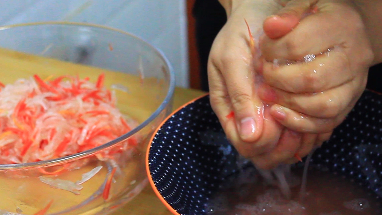 第二步,时间到了后把水倒掉,然后再把水分挤干一些。