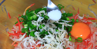 第三步,盆里打入2个土鸡蛋,加一些葱花,再来点儿虾皮加入一小勺盐,再来点儿胡椒粉,最后淋点儿食用油给它搅拌均匀。
