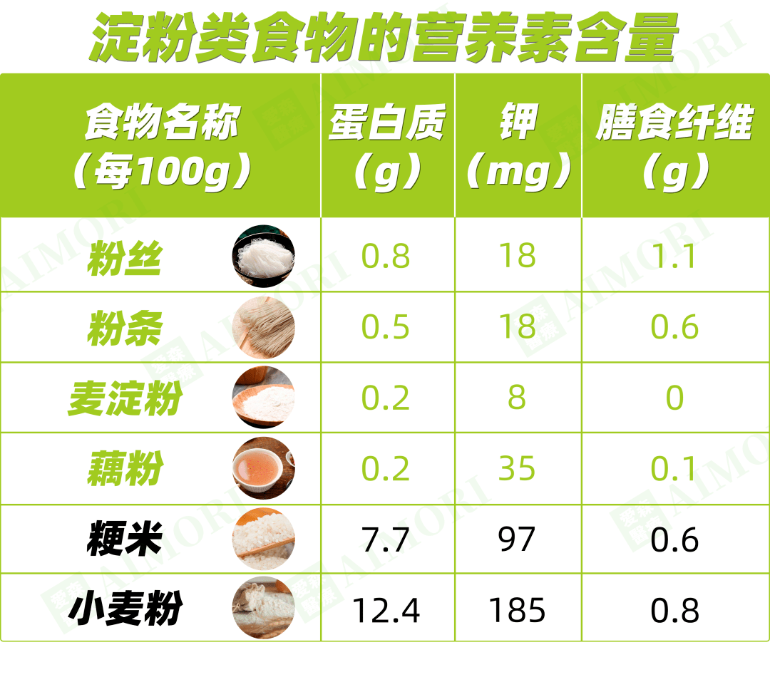 粉丝、粉条、麦淀粉、藕粉、玉米淀粉等都属于淀粉类,含蛋白质、钾、磷极低,主要为人体提供能量,帮助维持和提升体重,适合各类肾友食用。