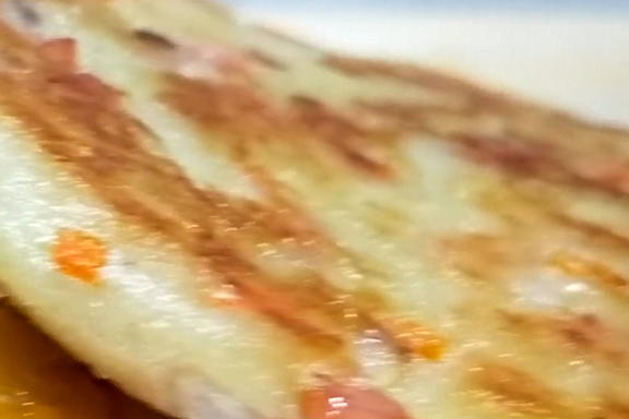 2. 在薄饼上打散鸡蛋,加入切好的蔬菜丝或碎丁。可以根据个人口味添加其他配料如肉丝、虾仁等。