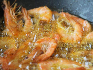 第四步,平底不粘锅取出来,大火将其烧至6成热的时候,转至小火,加上适量的花生油,将之前处理好的大虾,放入锅中,开始煎制,待其变色且熟透后,淋入适量的花雕酒;